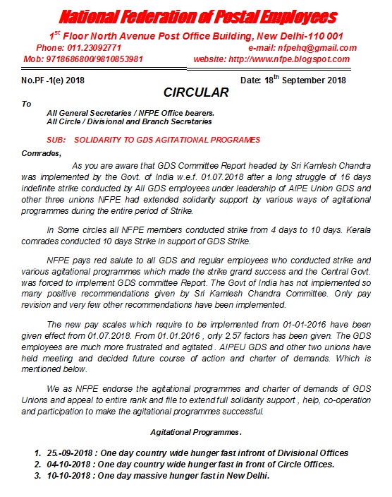 NFPE solidarity to GDS agitational programmes on 25th Sep., 04th & 10th Oct 2018