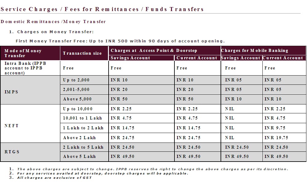 IPPB :: Service charges / Fees for Remittances / Funds Transfers ..........